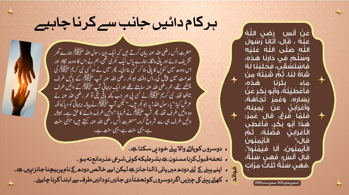 ہر کام دائیں جانب سے کرنا چاہیئے ( صحیح البخاری – 2432 صحیح مسلم – 2029 )