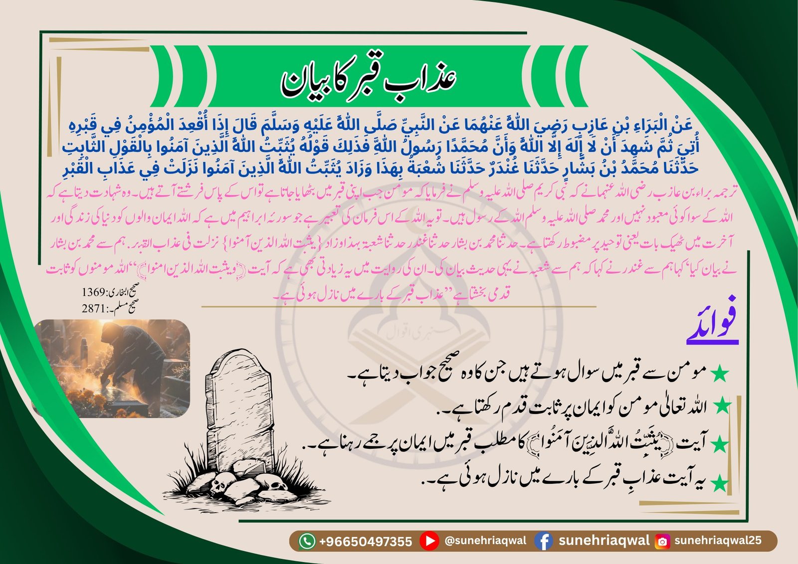۔ عذاب قبر کا بیان ( صحیح البخاری – 1369 صحیح مسلم – 2871 )
